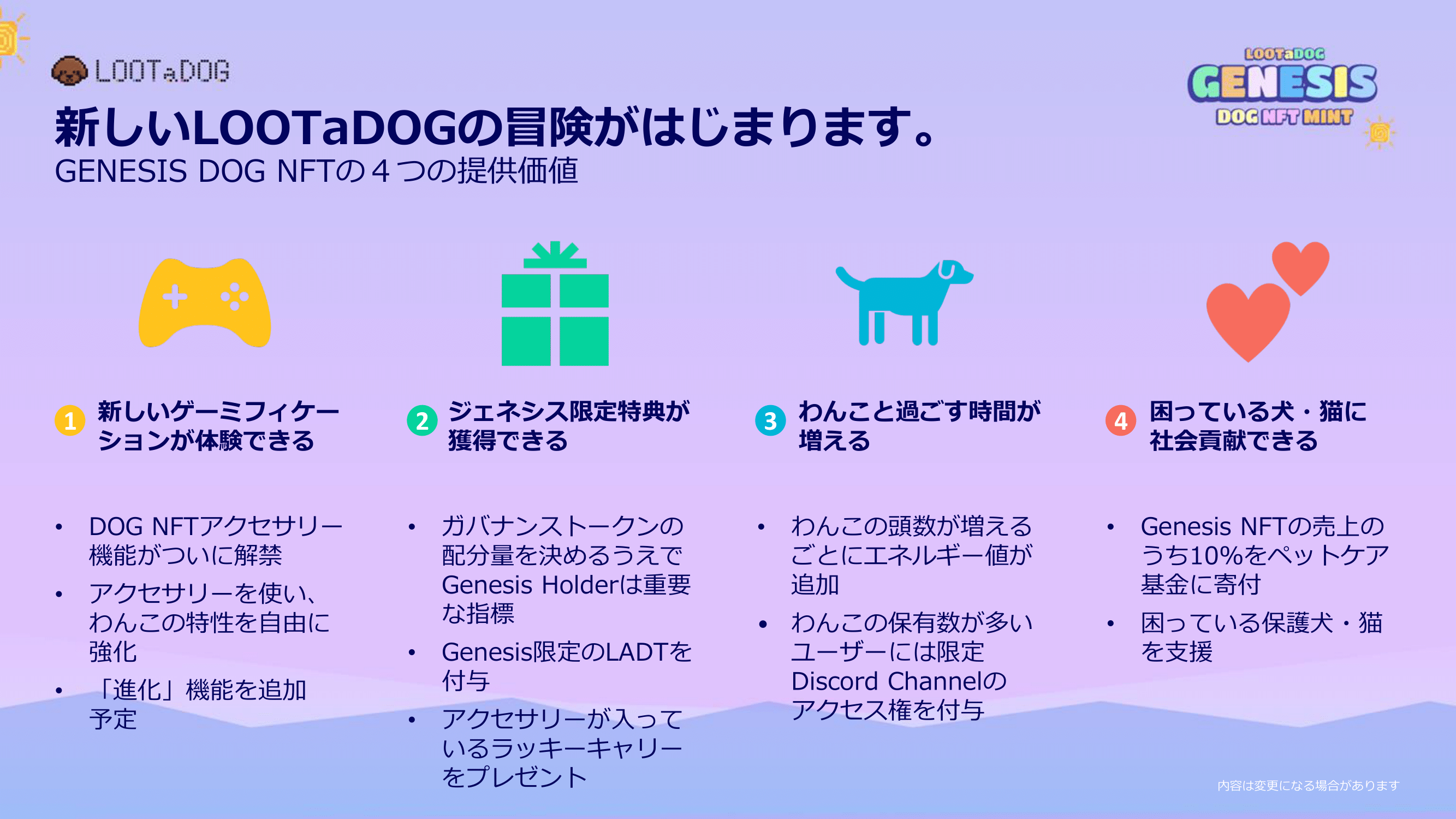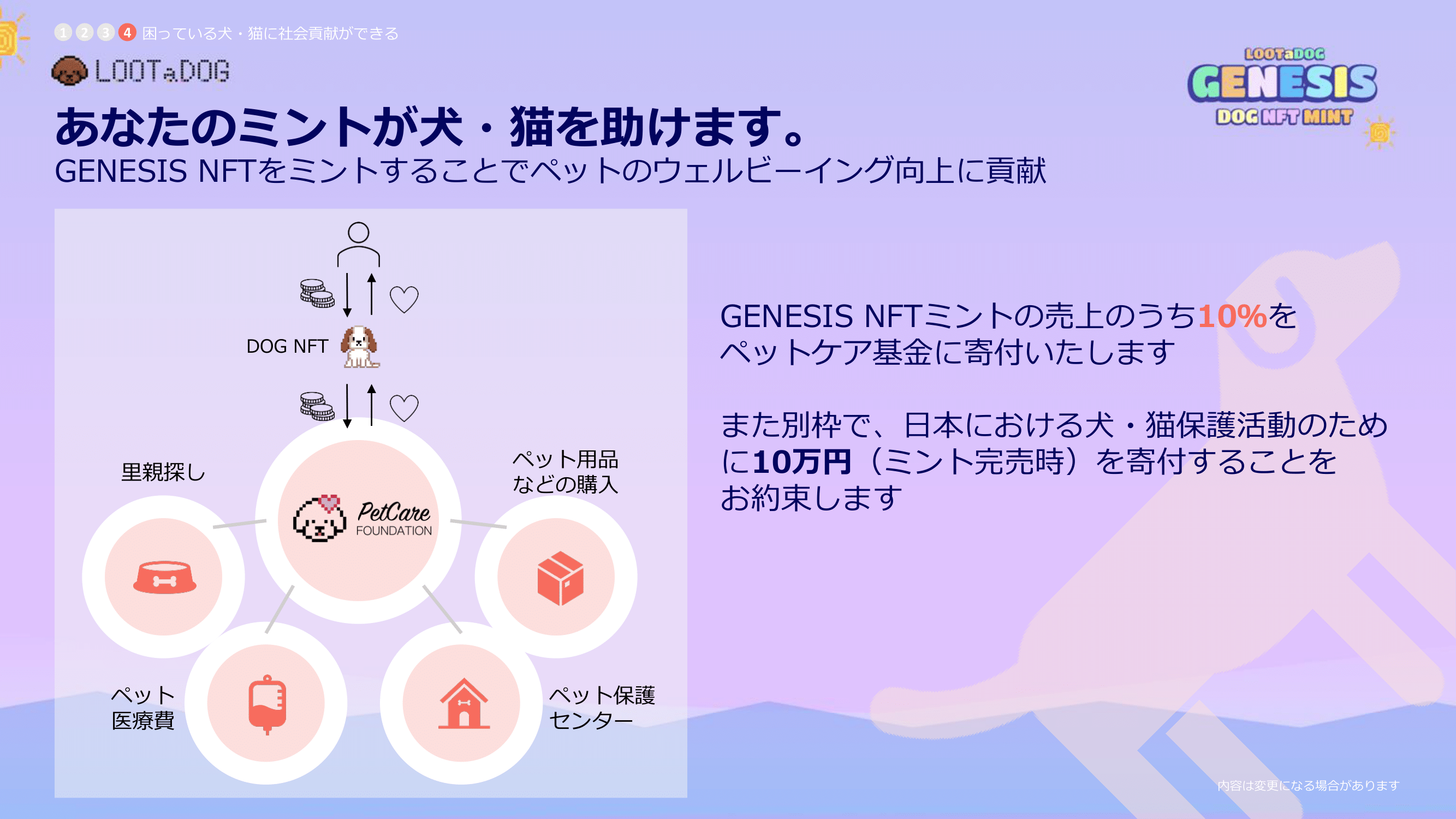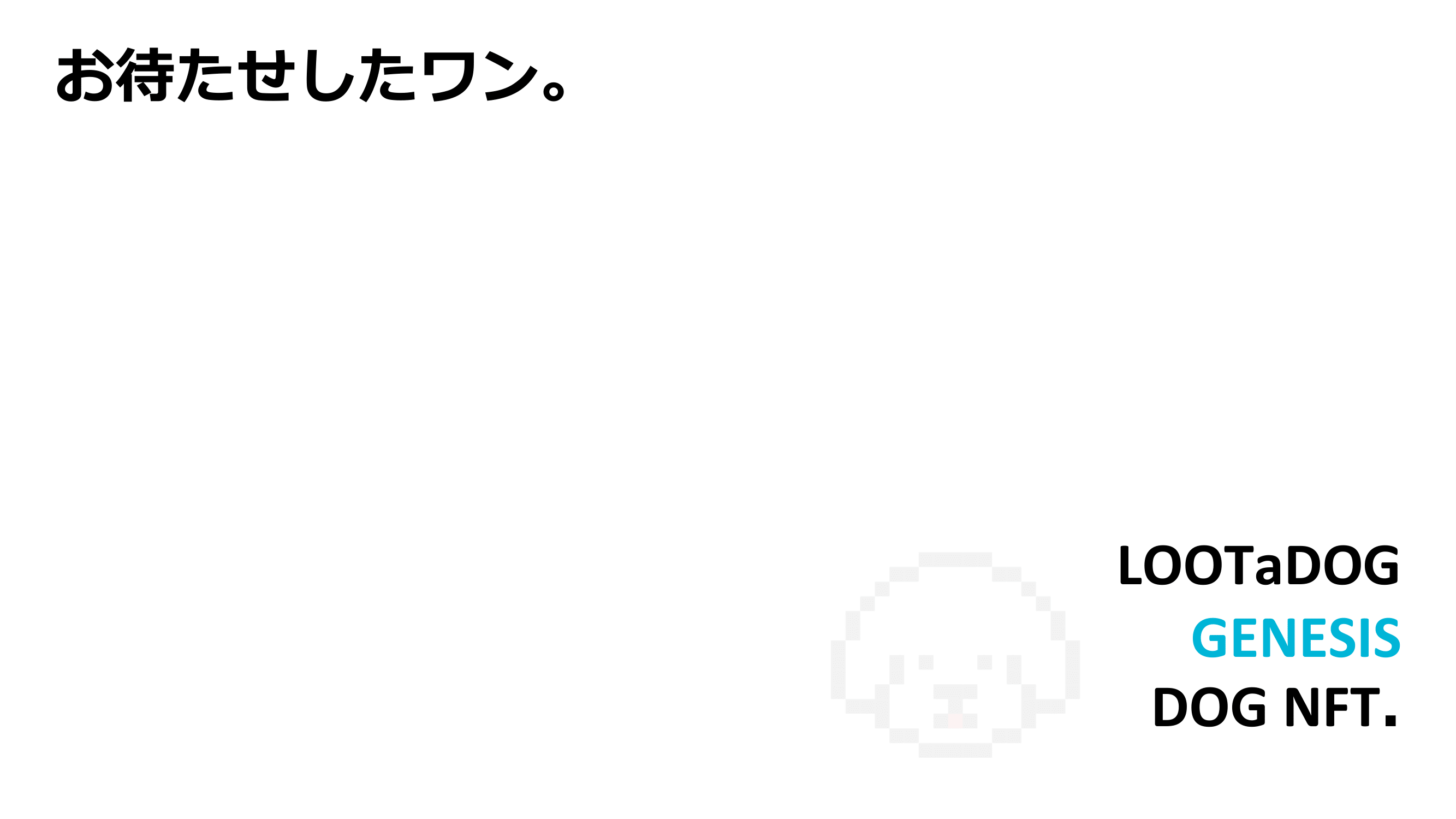<figure><img src="https://1435514023-files.gitbook.io/~/files/v0/b/gitbook-x-prod.appspot.com/o/spaces%2FdqAieRD8ahLuLd1ColN1%2Fuploads%2FPCXNE3ylM9sMOEjzhISW%2F%E6%97%A5%E6%9C%AC%E8%AA%9E%E3%82%AB%E3%82%99%E3%82%A4%E3%83%88%E3%82%99%E3%83%95%E3%82%99%E3%83%83%E3%82%AF%20DOG%20GENESIS%20DOG%20NFT-02.png?alt=media&#x26;token=733c1147-8e74-4467-aa3e-94bcbbdef426" alt=""><figcaption></figcaption></figure>