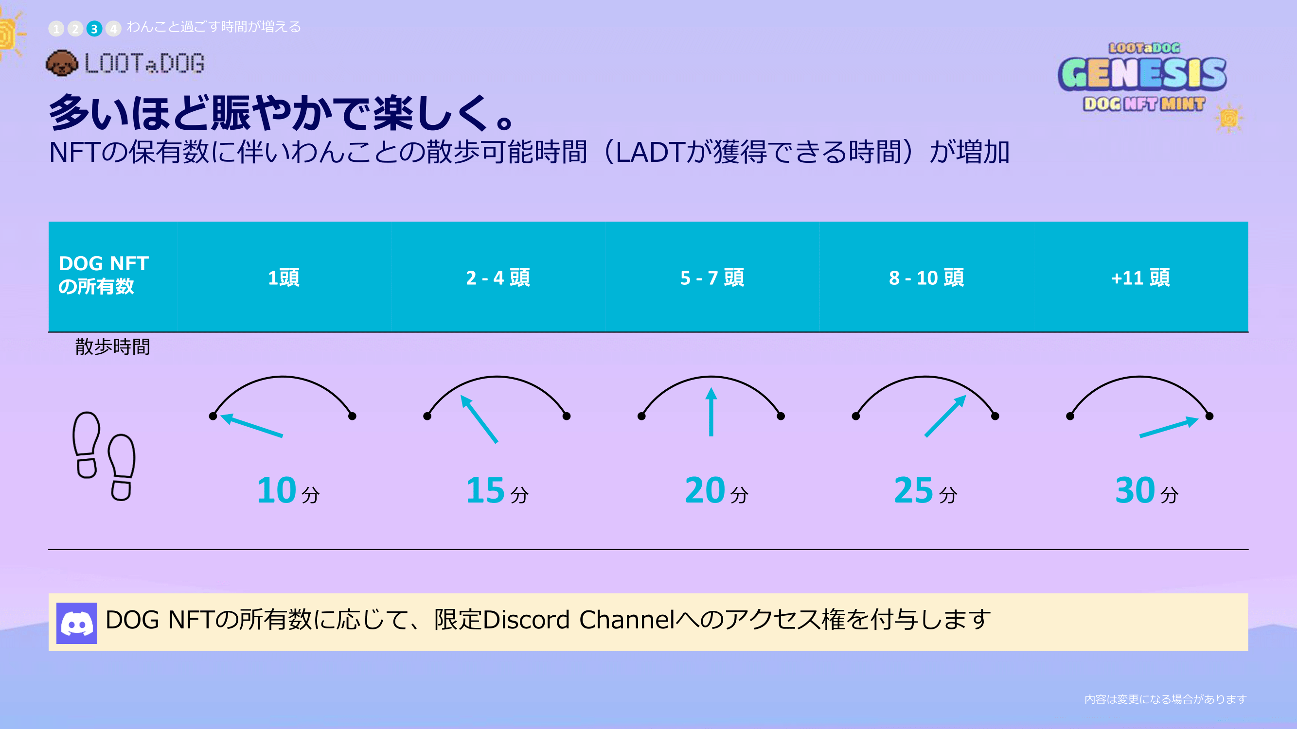 現在のLOOTaDOGでは、一度の散歩可能時間が最大10分程度となっておりますが、DOG NFTの購入数に応じて、散歩可能時間が増加します。