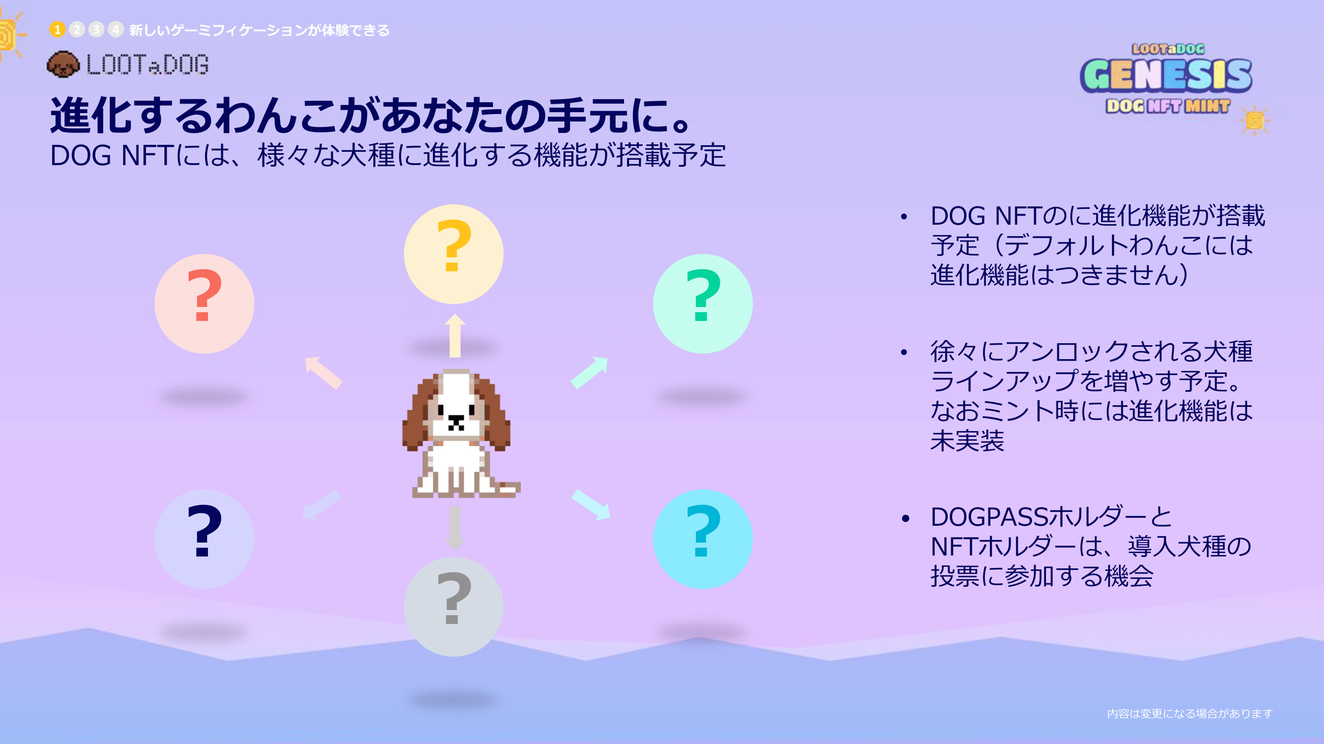 <figure><img src="https://1435514023-files.gitbook.io/~/files/v0/b/gitbook-x-prod.appspot.com/o/spaces%2FdqAieRD8ahLuLd1ColN1%2Fuploads%2FS69XcRUqfC9jyNEe7frv%2F%E6%97%A5%E6%9C%AC%E8%AA%9E%E3%82%AB%E3%82%99%E3%82%A4%E3%83%88%E3%82%99%E3%83%95%E3%82%99%E3%83%83%E3%82%AF%20DOG%20GENESIS%20DOG%20NFT-09.png?alt=media&#x26;token=10df79f2-ea12-4487-a6ec-6b07e8455624" alt=""><figcaption></figcaption></figure>